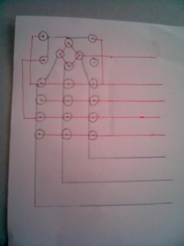 0613_105900.jpg 首先声明,这个不是小8的电路图,我是被论坛里一个兄弟逼的没办法了,上班时间画的,只是个大概的意思。大家可以看到很多红线和蓝线,按键有2个触点,用线连起来的点都是相通的,所以这些点在飞线的时候之用一根线就可以了,(测试共线的时候就把我累个半死,我没有工具,只好用个贴片的LED灯来测试共线,LED灯很亮就是共线,比较暗就是不共线(数字电路里基本不存在完全不通的两个节点,所以每两个点连接都会亮,只是明暗程度不同)图上一共有20个按键,如果用最笨的方法需要40根线,可是大家可以看到,通过测试共线的方法,我们只用了8根线,这样就把飞线减少到最小程度。这8根线的另一端要接我们改装的按键板,不管它原来是什么手机的,你都需要先测出它的共线电路图,然后通过给按键板打孔改造,把跟图上不一样的地方完全改成跟图上一样的情况,这个时候,要改装的按键板也会有8个节点,就是要跟我们这8根线相连的,按照对应的位置焊接好,就可以了。不明白的可以问我。